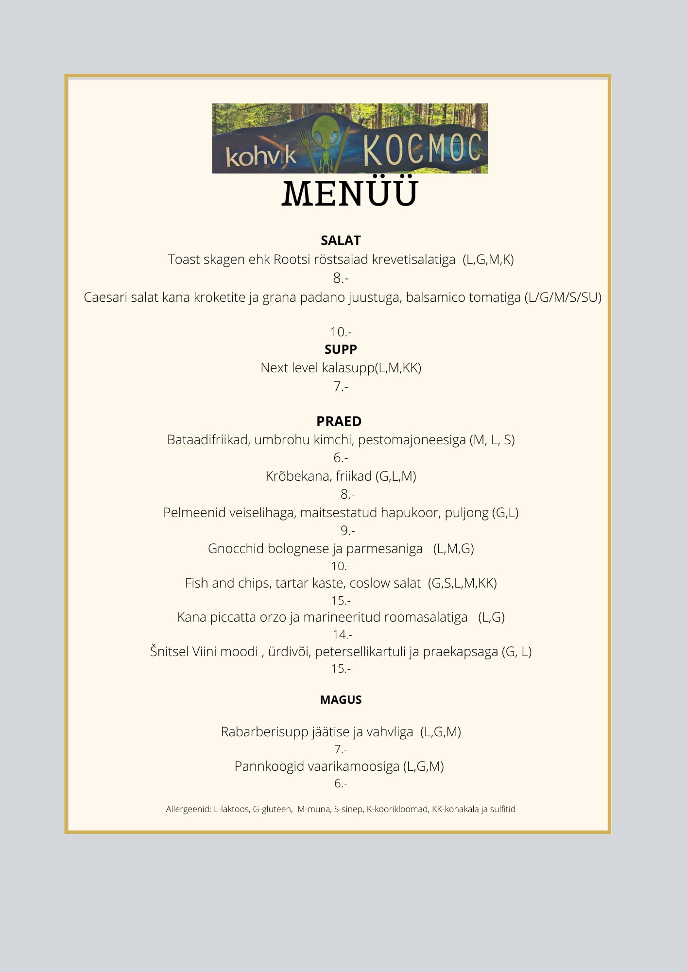 Au kohal on meie toitudes kohalik värske tooraine. Menüü on kokku põimitud Itaalia, Mehhiko ja Prantsusmaa toidukultuuridest, mis on kokku miksitud Eesti tooraine ning kultuuriga. Toidu kõrvale on võimalik nautida kõige ilusamat päikeseloojangut terves Eestis.